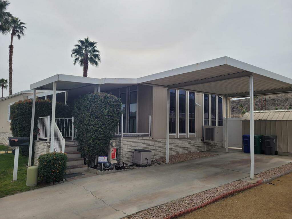This 1981 Madison home has some recent significant improvements but still allows for plenty of personalization. Steps from the carport lead to an east-facing covered deck. Two sets of doors access the home. The single front door leads to the living room, which runs the width of the house and has floor-to-ceiling windows along the north-facing wall. An evaporative cooler has been installed in one of the lower windows. Notice the vaulted and beamed ceilings. Around the corner to the left is the dining area with a built-in cabinet. The remodeled kitchen is just beyond. Stainless steel appliances and black granite counters accentuate the space beautifully. The wood-look laminate floors run through the kitchen and into the family room with a wet bar, creating a greatroom concept. Adjacent to the greatroom is a huge laundry area with a newer washer and dryer. The jack-and-jill, three-quarter bath lies between the laundry room and second bedroom with mirrored closet doors. At the south end of the home sits the spacious primary bedroom, which easily accommodates a king-size bed and dresser. A walk-in closet provides abundant clothing storage, while the primary bathroom has a large garden tub, toilet, dual vanity, and large shower behind a glass block wall. Sliding glass doors lead from the bedroom to the backyard, complete with three citrus trees. Less apparent updates to the home include a newer HVAC system and solar panels. Space rent for this home is $875/month.