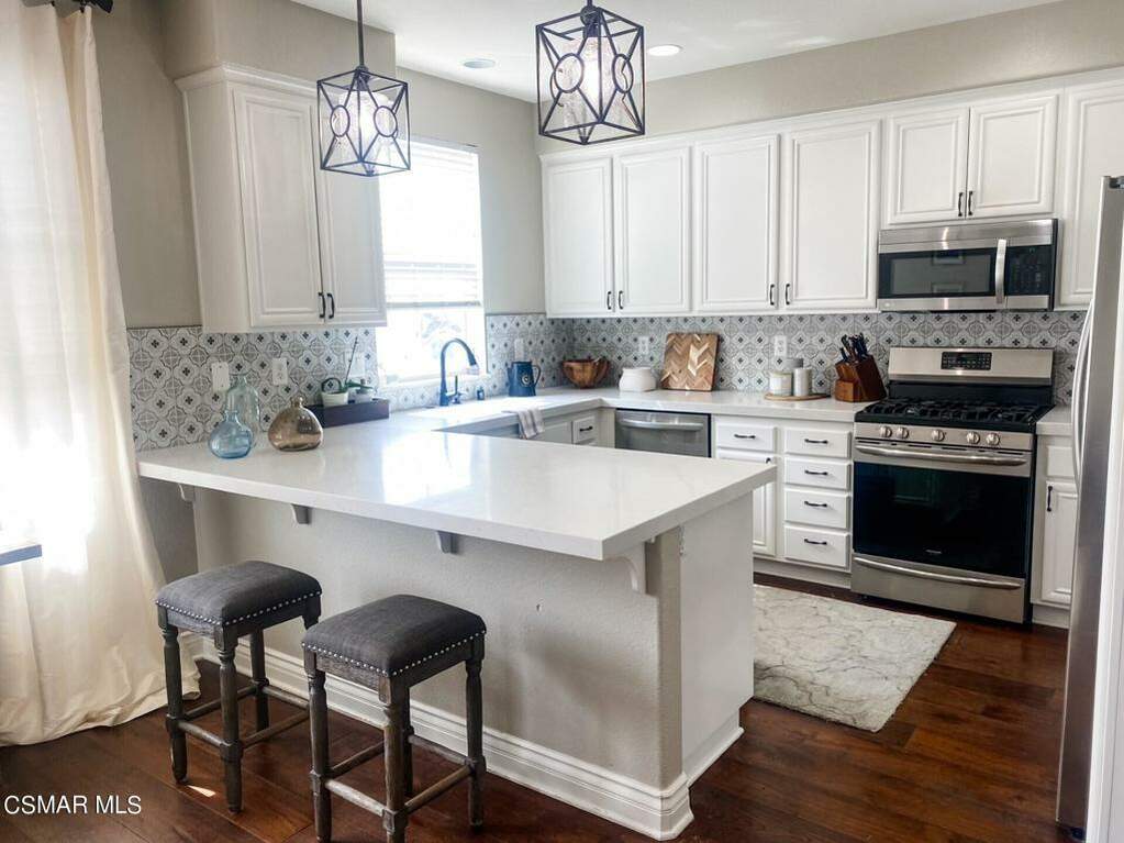 Welcome to this completely remodeled, 3 bed, 2.5 bath Aldea townhome in desirable Dos Vientos! Upon entering you'll find a large living room/dining room combo with sleek hardwood flooring which opens up to the stunning kitchen with quartz counters, stainless-steel appliances and upgraded cabinets. The powder room, located on the main level has been upgraded with a granite counter vanity and designer mirrors. Upstairs boasts all 3 bedrooms and 2 additional baths, including the primary suite with gorgeous quartz counters, a large soaking tub and a separate upgraded shower. From the living area, take the steps down to the oversized garage with direct access and the laundry area, which is located in the garage. Enjoy Mt. Boney views from inside this beautiful townhome, and park views from your private patio. There is a beautiful pool and spa located within the community, and Dos Vientos has great parks, restaurants, shopping and schools!