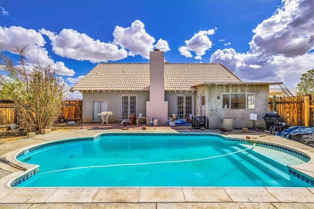 Discover this enchanting 1-bedroom, 1-bathroom pool home in sought-after north central Joshua Tree. Nestled on over an acre of land, this property exudes character with its gabled windows, tile roof, and mature landscaping. Perfect for a creative touch, this home has all the potential to become your dream desert getaway. Step inside to find a cozy living room featuring a stunning stone fireplace, cool wood-beamed ceilings, and large banks of windows that fill the space with light and offer serene desert views. The kitchen is well-equipped with stainless steel appliances and abundant wooden cabinetry, leading to a spacious raised dining room perfect for gatherings. The bedroom is generously sized, and the bathroom boasts a large, remodeled walk-in shower. An indoor laundry room adds convenience to this charming home. The outdoor space is a true oasis. The backyard features a sparkling in-ground pool surrounded by a concrete and brick patio, mature landscaping, and wooden privacy fencing, creating an ideal setting for relaxation or entertaining under the desert sky. Located just minutes from downtown Joshua Tree and the iconic Joshua Tree National Park, this home is an incredible opportunity to embrace the desert lifestyle. With some updates, it could become the ultimate retreat or investment property. Schedule your tour to see this special find for yourself!