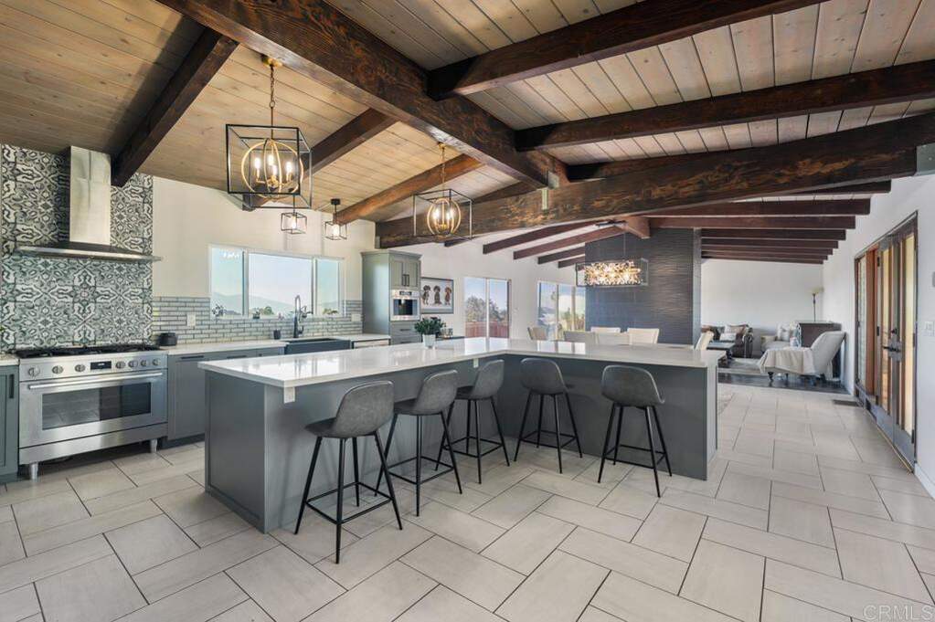 Nestled in the hills of Mt. Helix, this beautifully reimagined 5-bedroom, 2.5-bathroom mid-century multi-level home offers a perfect blend of timeless architectural charm and elevated modern living. Boasting 3,484 sq ft of interior space on nearly half an acre (.48 acres), this property delivers flexibility, privacy, and panoramic views in one of East County's most desirable enclaves. Step inside to soaring beamed ceilings and an open-concept great room with picture windows that flood the home with natural light. The renovated chef's kitchen is the heart of the home, featuring a dramatic oversized island, designer backsplash, premium appliances, and sleek cabinetry-ideal for entertaining or culinary inspiration. Gather in the spacious dining area or unwind in the cozy living room with a show-stopping fireplace and floor-to-ceiling views of the mountains beyond. Outside, a wraparound deck creates the perfect perch to sip your morning coffee or dine al fresco while taking in sweeping views of the lush landscape and surrounding hillsides. The expansive lot offers room to explore, garden, or even build a potential ADU (Accessory Dwelling Unit) or a pool. The terraced yard offers charm and opportunity for outdoor play, fruit trees, or hillside landscaping. Upstairs, retreat to the spacious primary suite with serene vistas and a spa-like bathroom. The home's flexible layout also lends itself to multi-generational living or a home office setup-perfect for today's evolving needs. Located in the prestigious Mt. Helix community of La Mesa, you'll enjoy the best of quiet suburban living with close proximity to shopping, dining, top-rated schools, and freeways. Don't miss your chance to own this rare, view-filled mid-century beauty in one of La Mesa's most sought-after neighborhoods.